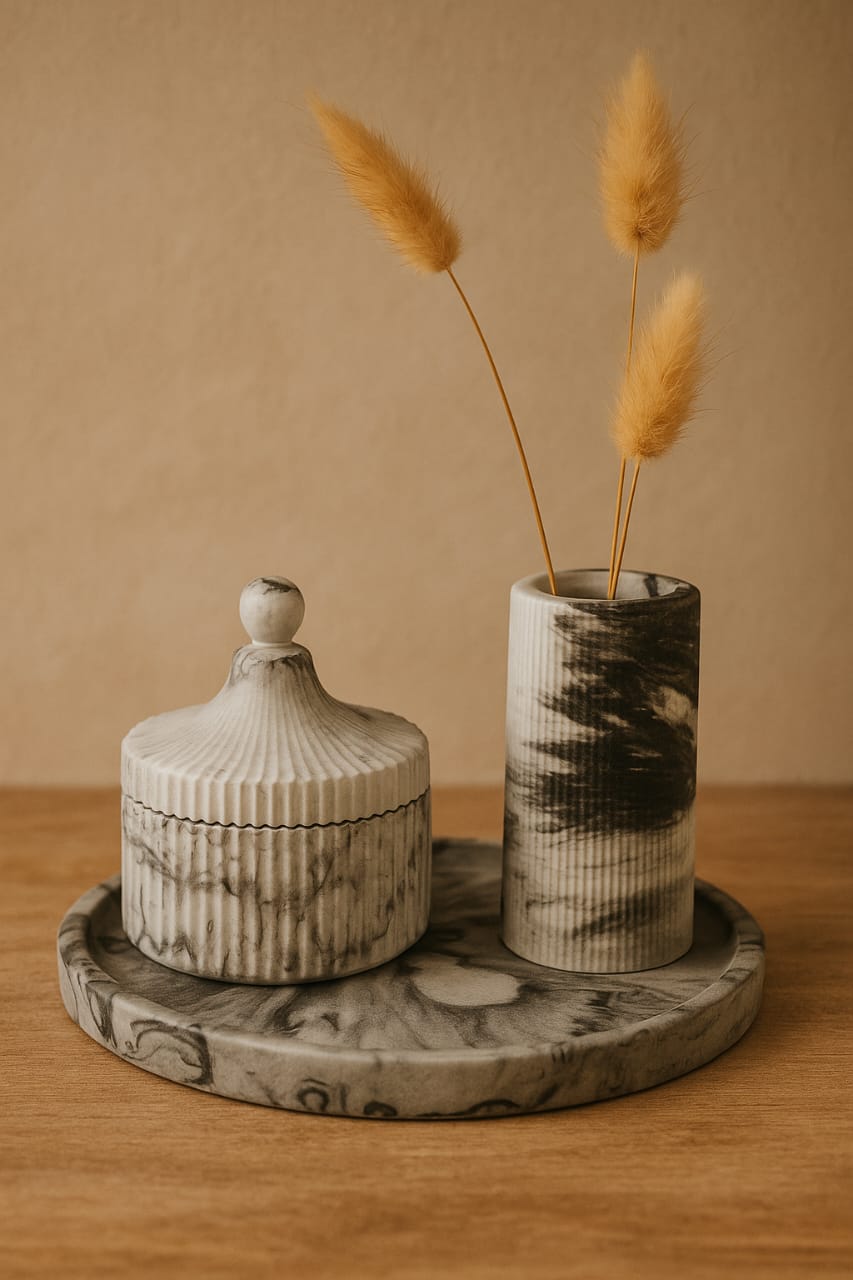 Ένα minimal και άκρως κομψό διακοσμητικό σετ σε γήινους τόνους. Το μαρμάρινο καπάκι-κερί συνδυάζεται αρμονικά με το κυλινδρικό βάζο, διακοσμημένο με απαλές αποχρώσεις και φυσική υφή. Οι αποξηραμένες μπουκετίνες προσθέτουν μια αίσθηση ζεστασιάς και διακριτικής πολυτέλειας. Το σύνολο ολοκληρώνεται με μία καλαίσθητη βάση, ιδανική για να αναδείξει κάθε χώρο — από καθιστικό έως υπνοδωμάτιο.