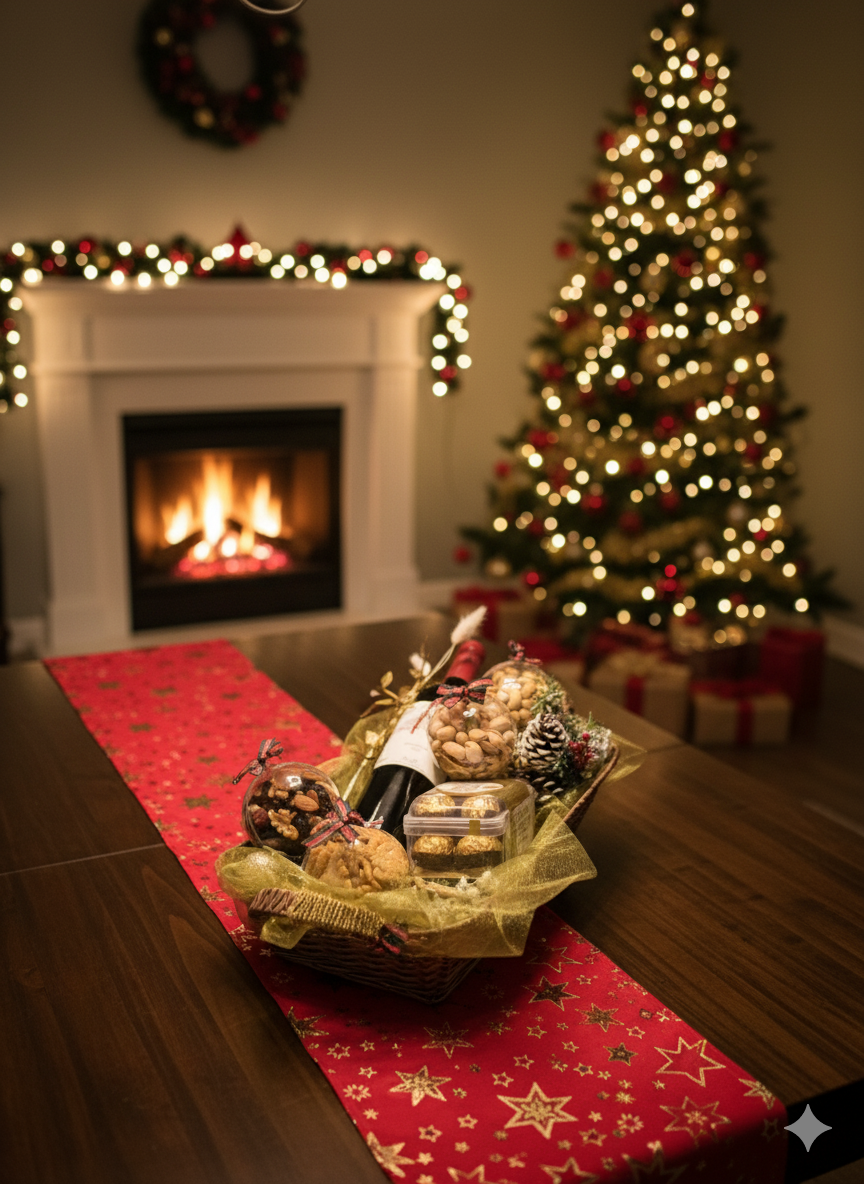 Ζήστε τη μαγεία των γιορτών μέσα από μια επιμελημένη gourmet συλλογή που αποπνέει κομψότητα και πολυτέλεια. Ένα εκλεκτό μπουκάλι κρασί, premium σοκολατάκια, αρωματικοί ξηροί καρποί και χειροποίητες λιχουδιές συνδυάζονται σε ένα χρυσό, καλαίσθητο καλάθι που αποδίδει την απόλυτη εορταστική εμπειρία. Η πλούσια διακόσμηση, οι χρυσοκόκκινες λεπτομέρειες και η ζεστή χριστουγεννιάτικη ατμόσφαιρα ολοκληρώνουν ένα δώρο που δεν χαρίζει απλώς γεύσεις — προσφέρει στιγμές απόλυτης απόλαυσης και γιορτινής πολυτέλειας.
